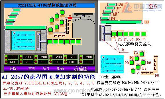 在人機界面實時監控多臺SZDJLSLX-4186型超低溫深冷箱,在觸摸屏流程圖上實時監控運行狀態,群控低溫深冷箱,用開關量輸入模塊AI-3011D5M模塊來實現低溫深冷箱運行狀態的反應。