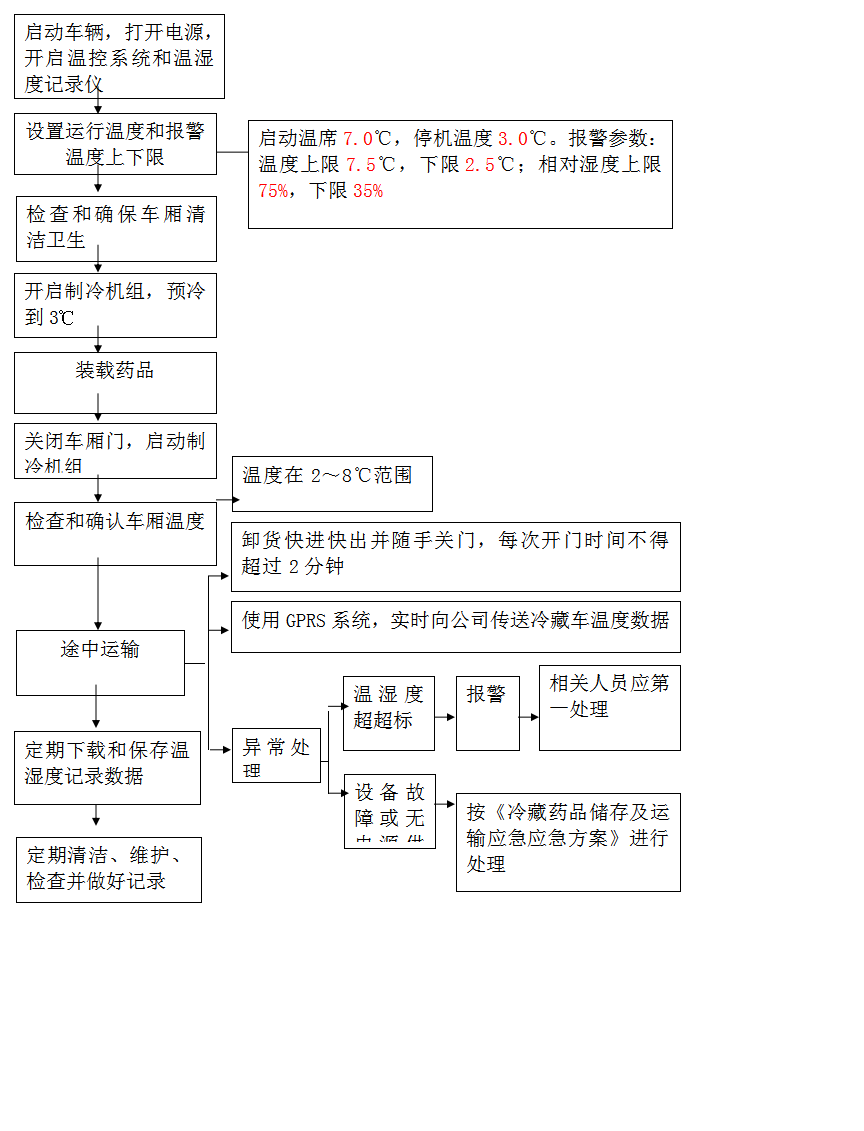 5.2.7出車前檢查:檢查內外風機運轉是否正常,制冷是否正常。檢查門封是否嚴密,車廂是否保溫。檢查溫濕度記錄儀是否正常記錄。當溫度達到2-8℃范圍時,檢查合格后,放行出車。